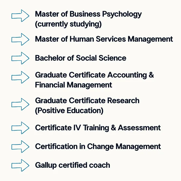 I love helping people use their strengths to thrive at work (& right across their life!) I’ve been coaching & leading teams since 2002 & that means I’ve seen & done a lot. Tap into that experience & thousands of hours of learning to tackle your goals & challenges.