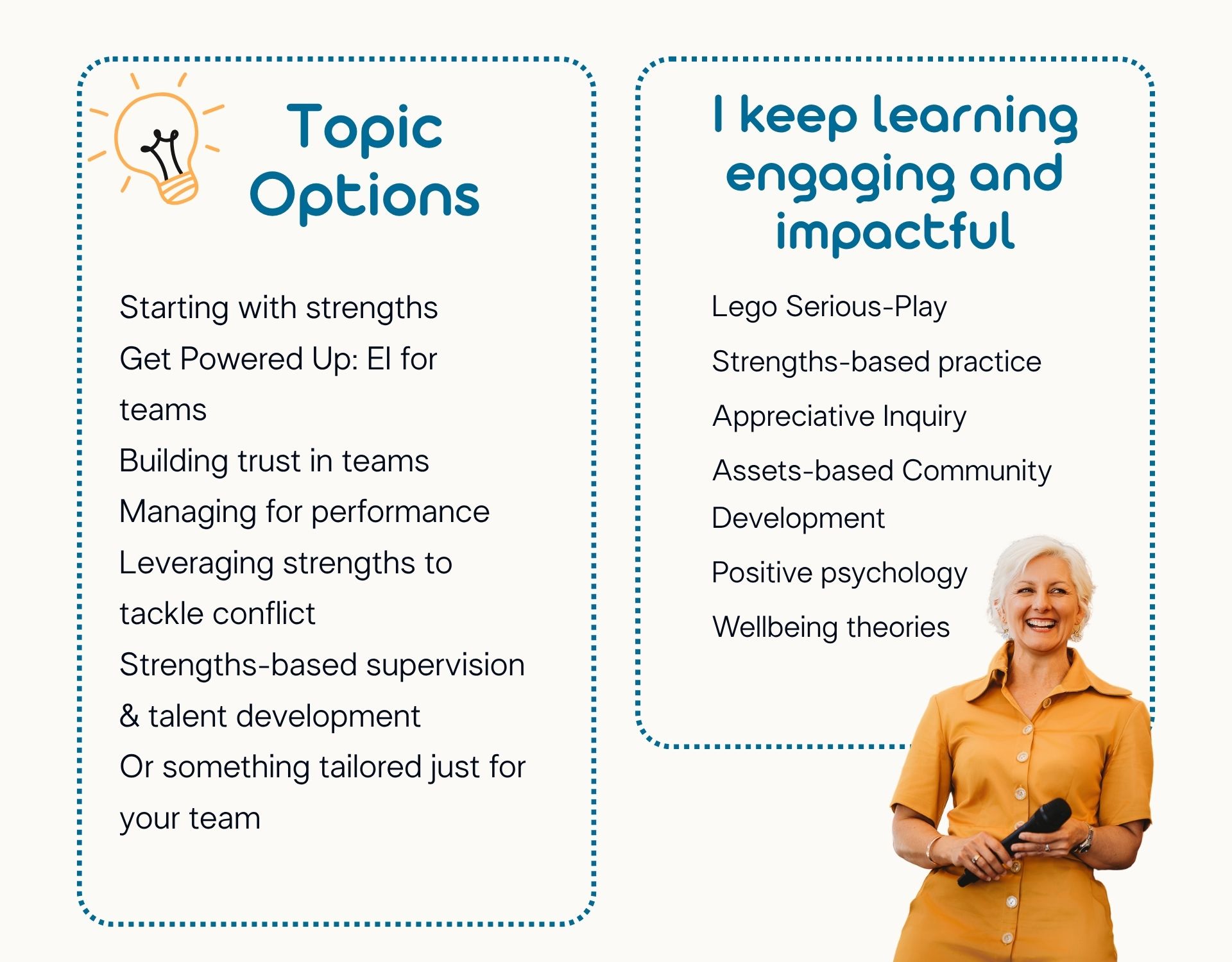 So many team members expressed to me how great the session was & how much they got out of it. They are looking forward to implementing the action plan. Thank you so very much for an inspiring, informative, & motivating workshop.
